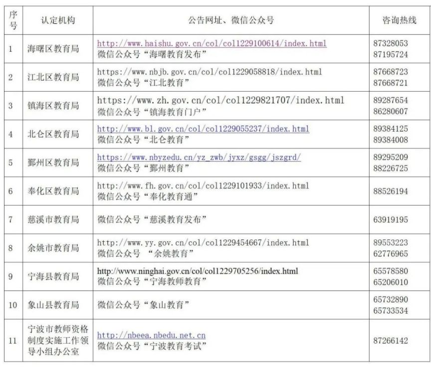 业务咨询:为方便申请人在网报前后咨询教师资格认定工作相关政策,宁波市教师资格制度实施工作领导小组办公室和区(县、市)教师资格认定机构通过网站、微信公众号发布教师资格认定公告,并开通咨询电话,在工作日为申请人提供全面的咨询服务,解答教师资格认定报名期间各类问题(具体咨询电话详见下表)