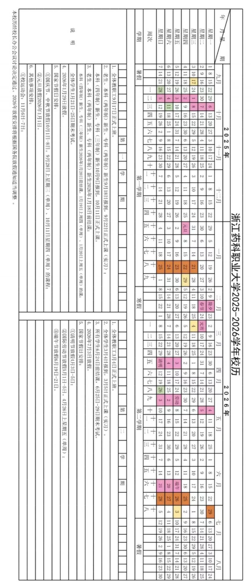 以下是根据2025-2026学年度的常规安排,提供的浙江药科职业大学校历概览及重要时间节点。请注意,具体日期可能会根据学校实际情况有所调整,以下信息仅供参考: