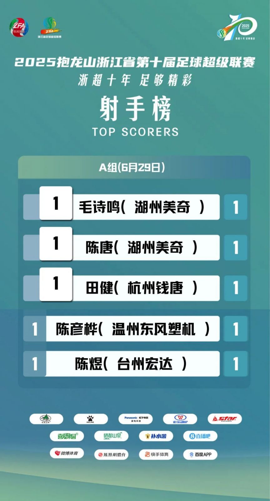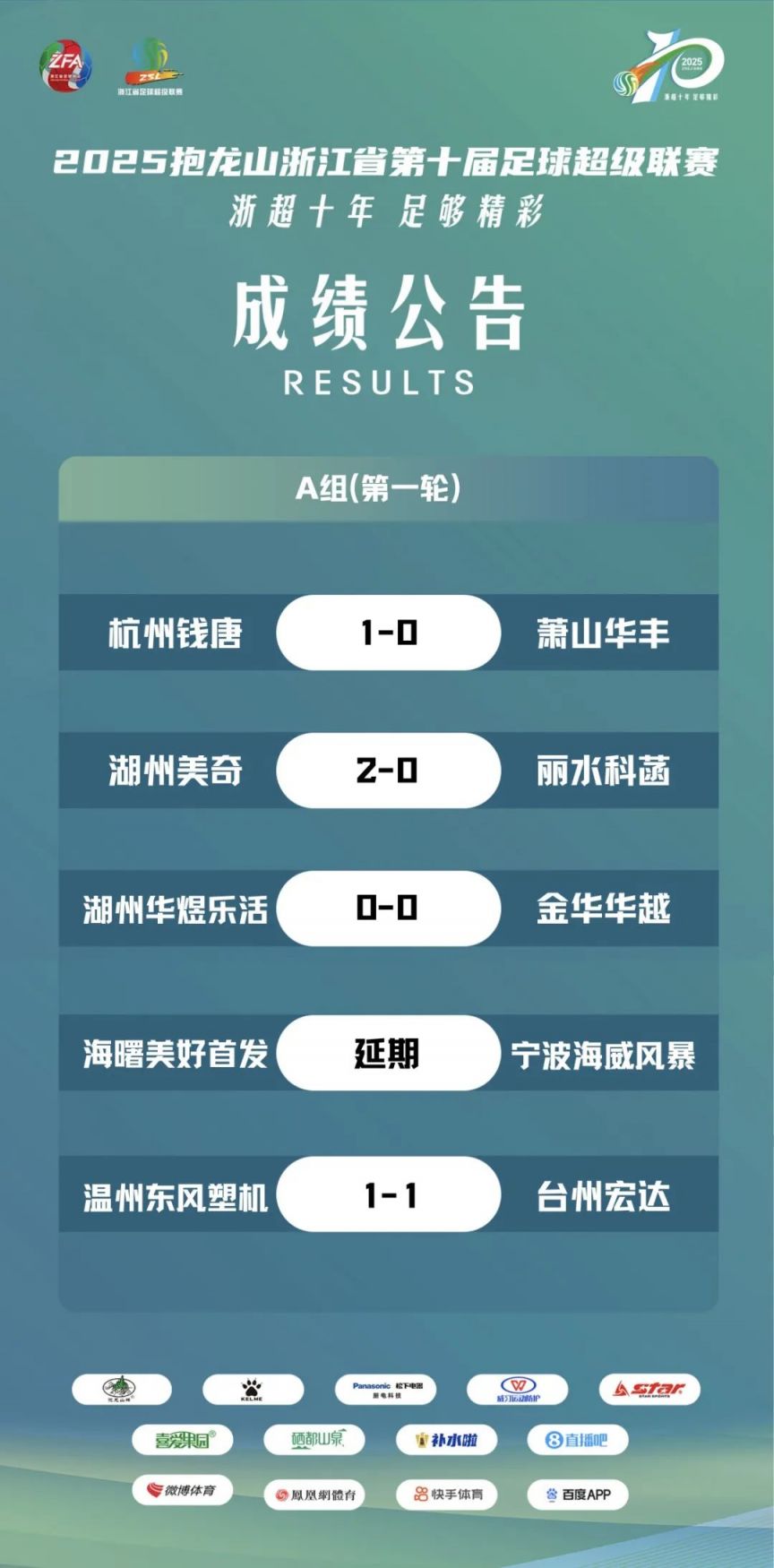 6月28日-6月29日,2025抱龙山浙江省足球超级联赛A组第一轮开赛,具体赛况为:杭州钱唐1-0萧山华丰;湖州华煜乐活0-0金华华越;温州东风塑机1-1台州宏达,湖州美奇2-0丽水科菡。