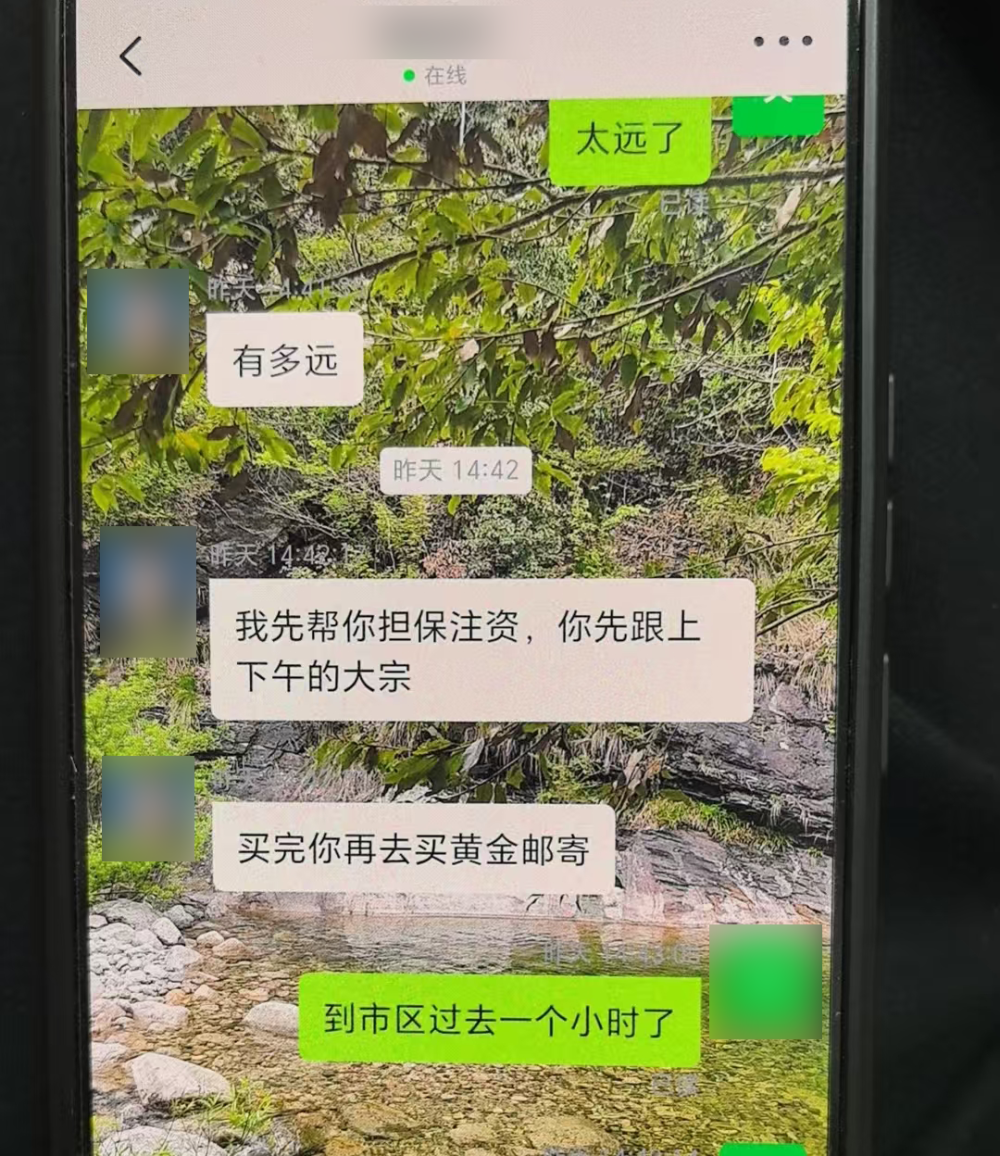 聊天记录里“担保”“邮递”等字眼频繁出现,对方要求购买10万元黄金作为保证金,并邮寄到指定地点完成股票投注。